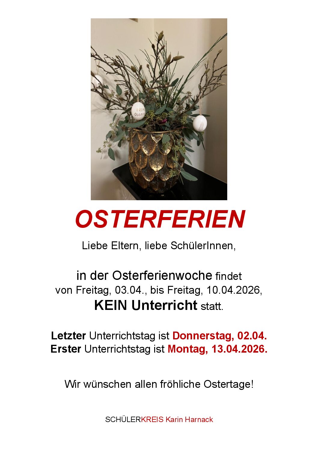 ACHTUNG: KEIN UNTERRICHT IN DEN OSTERFERIEN 2026!
