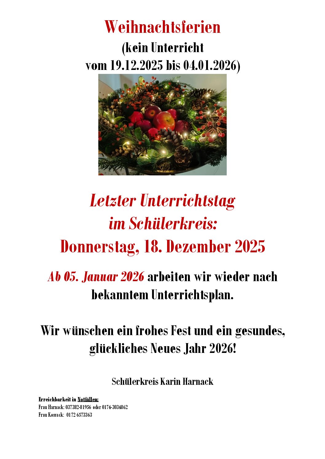 Der letzte Unterrichtstag vor den Weihnachtsferien wird in unserer Einrichtung Donnerstag, 18. Dezember 2025, sein. Wir beginnen im neuen Jahr am 05. Januar 2026.