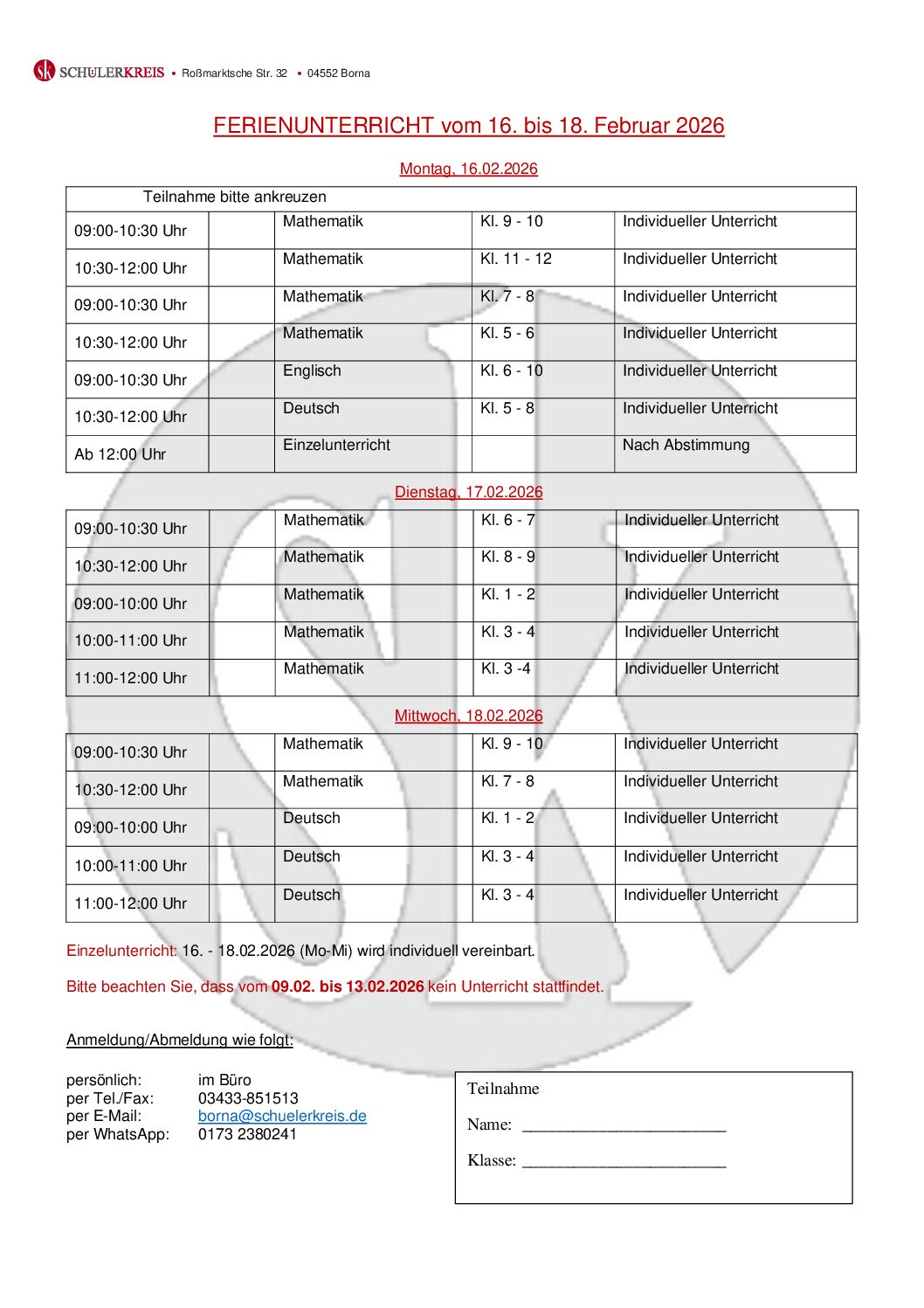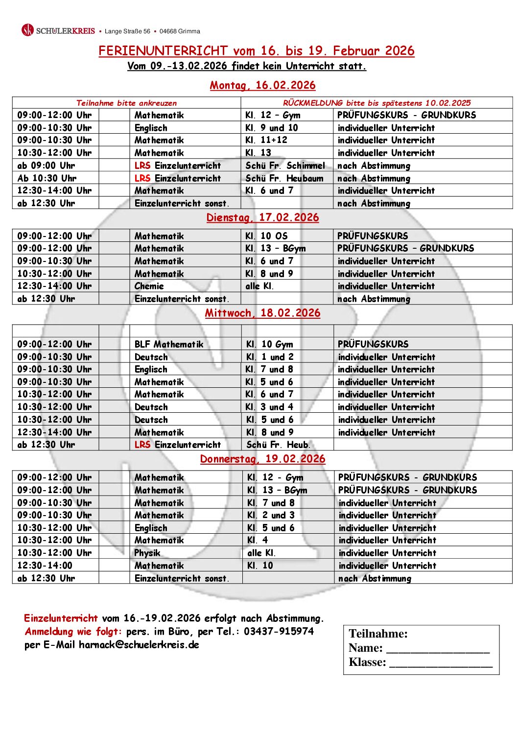 Für die bevorstehenden Februarferien erhalten Sie mit diesem Elternbrief unsere Angebote. Beachten Sie bitte bei Ihrer Planung, dass der Unterricht und die Prüfungskurse in der zweiten Ferienwoche vom 16.02.-20.02.2026 zu veränderten Zeiten stattfinden. Der Ferienunterricht wird klassenstufenentsprechend durchgeführt, um allen Teilnehmern die Möglichkeit zu geben, individuelle Schwerpunkte und Fragen zu bearbeiten. Die Kurse sind dementsprechend nur mit maximal 4 Teilnehmern belegt. Termine für Grundschüler, Einzelunterricht und Lerntherapie werden individuell vereinbart. In der ersten Ferienwoche (09.-13.02.2026) findet kein Unterricht statt.